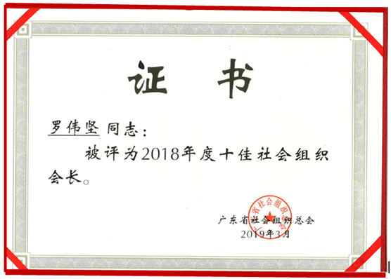 2019年3月29日下午,廣東省社會組織總會三屆四次會員大會暨評先選優(yōu)大會在廣州東方賓館召開。會上,羅偉堅(jiān)會長獲頒“2018年度十佳社會組織會長“榮譽(yù)證書。